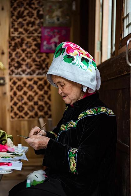 蜡染店里做蜡染扎染的、载歌载舞的,