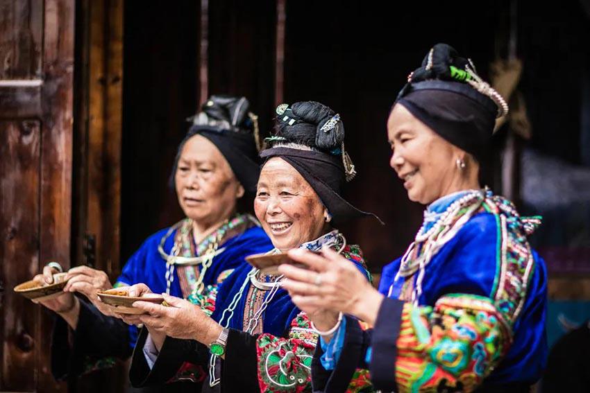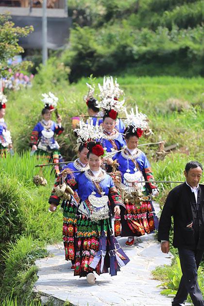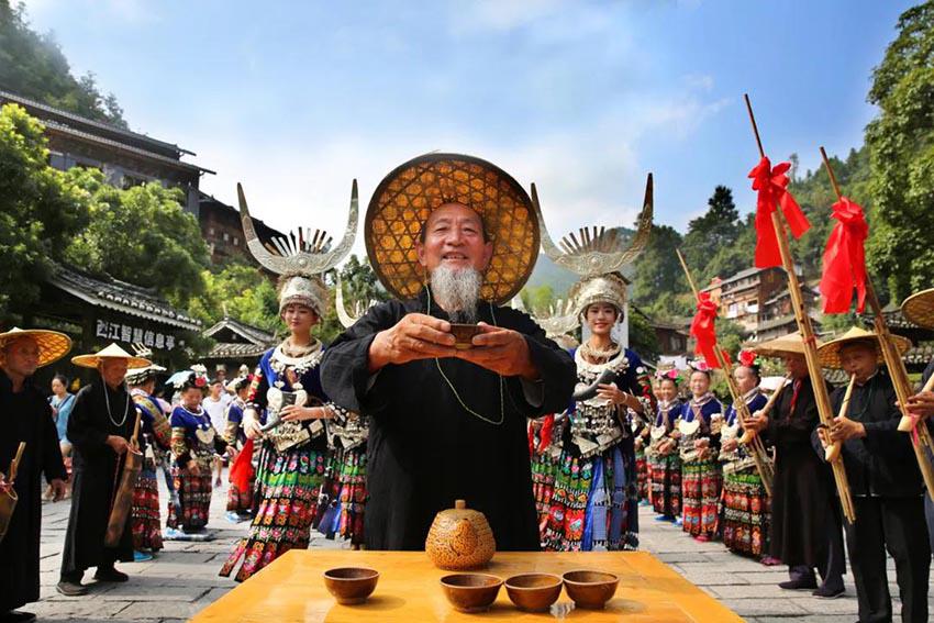 在苗寨北门,游客畅饮十二道拦门酒,感受苗家迎接宾客的最高礼节。