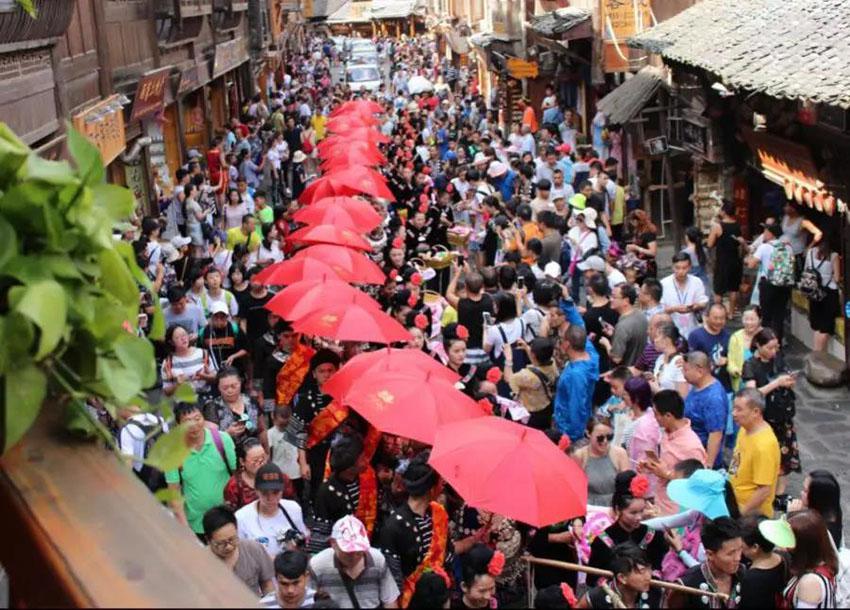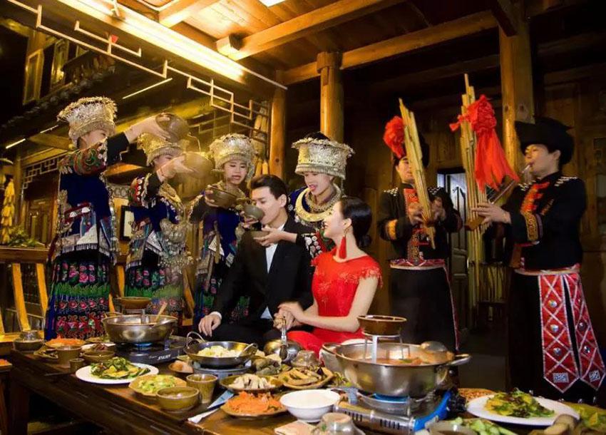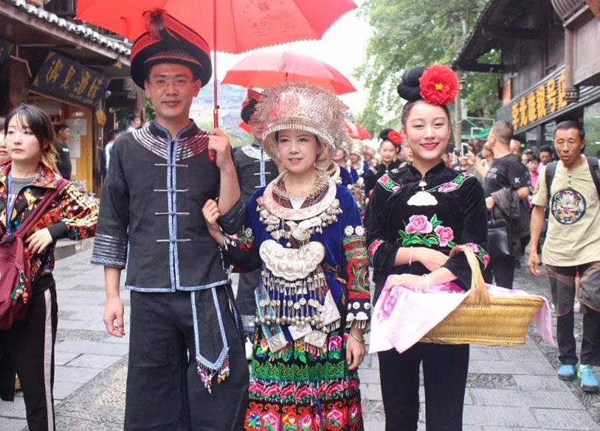 本次活动将以苗族婚俗文化作为基础,邀请幸运嘉宾体验当地传统婚礼习俗,当天在场的游客可以参与到如共绘最美苗家嫁衣的活动中来,也能观赏到苗家偷亲、苗族特色长桌宴等活动。活动过程亮点纷呈,其中,在万人共绘最美苗家嫁衣环节,伴郎伴娘将与游客、大V和非遗传承人一起喷绘苗家嫁衣服饰,并邀请现场游客体验苗银打造。在偷亲环节,伴郎伴娘团将帮助新郎将新娘从窗口送出去,成功后,伴郎伴娘将和新人一起跳舞庆祝,还有苗族特色竹竿舞、高山流水酒等独具苗家特色的风俗活动。最后,偷亲队伍和新人将身着苗族服饰一起上街巡游,向游客发喜糖,将喜事与众人分享。