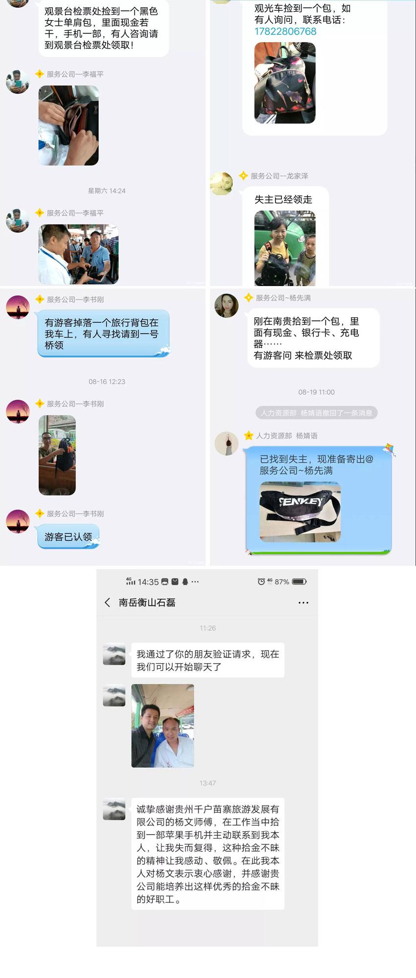 假期游客多,很多游客把自己的背包、钱包、手机等物品遗落在景区,景区工作人员在拾到游客物品后都会立即联系失主,高效地为游客解决问题,尽最大努力保障游客安全,他们以实际行动赢得了游客的信任和赞誉。
