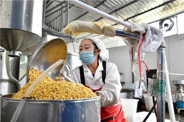 豆制品加工厂发展壮大的同时,也为当地村民提供就业岗位,有效缓解了当地的就业压力,提高了当地群众的经济收入。“从这个建厂以来我就来这里上班的,这里离家很近,又可以在家里照顾娃儿,不用外出去务工,工资也稳定,平常不加班时候都能做三四千块钱,多劳多得,加班了还高点,都是手上活,比较轻松。”正在加工豆腐的工作人员张静告诉记者。